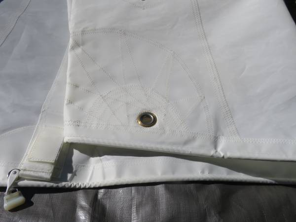 Lee Sailmaker full batten, loose foot mainsail with two sets of reef points. Triple stitched seams. Luff 25' 8"; foot 9'; area approx 120 aq ft.; four full length battens (3' to 8'6") and one fixed batten near the head of the sail. Includes sail bag. This sail has never been used. It was ordered for a 26 foot sailboat, but the boat was written off in a winter storage warehousing incident.
