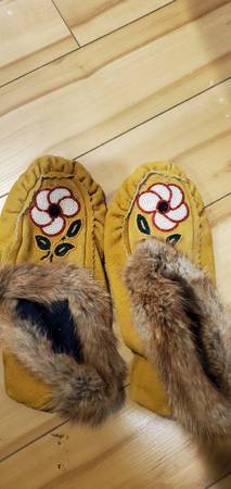 Beautifully handmade moccasins with soft durable materials liner built in with real and genuine fur. Intricately hand designed extremely talented beaded flower design. In excellent condition. Size...