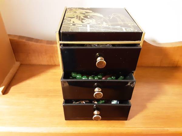 Handcrafted Otagiri (Japan) original Black laquer jewelry box. Gold color inlay picture on top. Lip opens to display a mirror. 3 pull out drawers with gold color pulls. Size 5" x 4" x 3.75" Excelent...